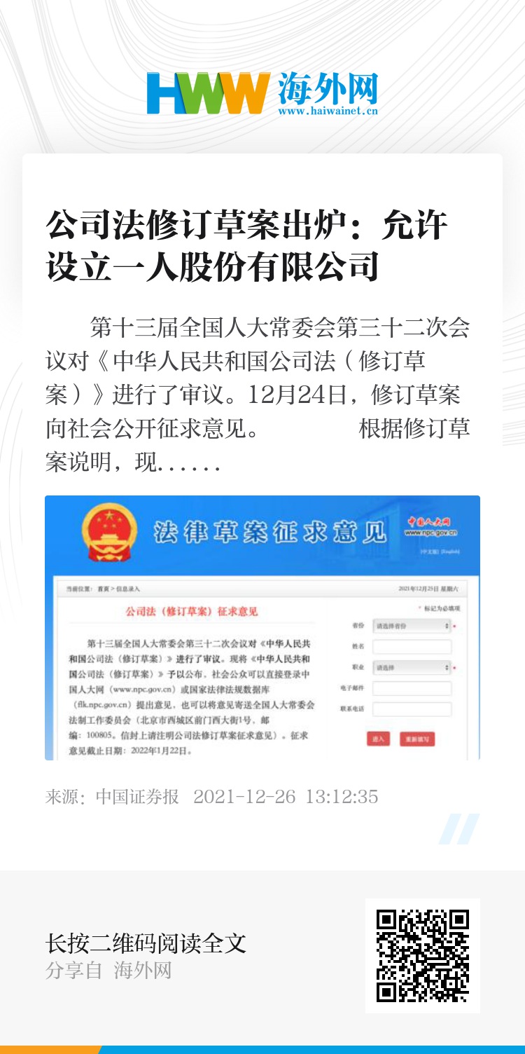 第十三届全国人大常委会第三十二次会议对《中华人民共和国公司法(修订草案)》进行了审议。12月24日,修订草案向社会公开征求意见。