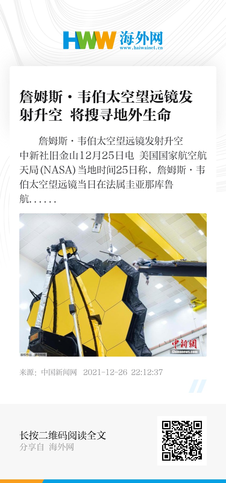 NASA在其官网称,美国东部时间25日7时20分,詹姆斯·韦伯太空望远镜由阿丽亚娜5型火箭发射升空。地面科研人员在火箭发射大约5分钟之后开始接收来自詹姆斯·韦伯太空望远镜的遥测数据。飞行27分钟后,望远镜与火箭分离并进入预定轨道。