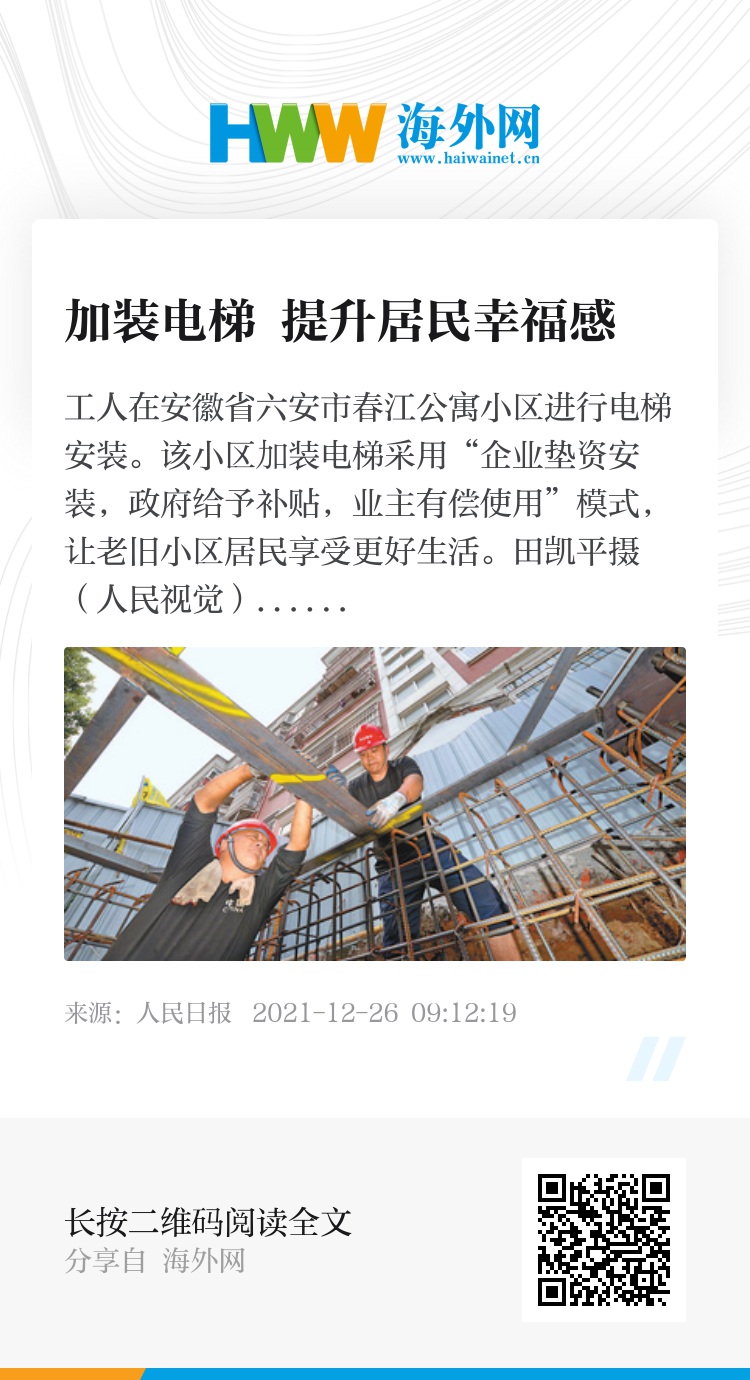 工人在安徽省六安市春江公寓小区进行电梯安装。该小区加装电梯采用“企业垫资安装,政府给予补贴,业主有偿使用”模式,让老旧小区居民享受更好生活。田凯平摄(人民视觉)