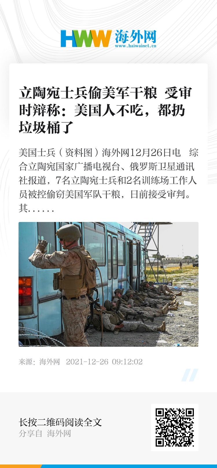 海外网12月26日电 综合立陶宛国家广播电视台、俄罗斯卫星通讯社报道,7名立陶宛士兵和2名训练场工作人员被控偷窃美国军队干粮,日前接受审判。其中一名被告辩解称,美国人经常不吃干粮,把它们扔进垃圾桶。