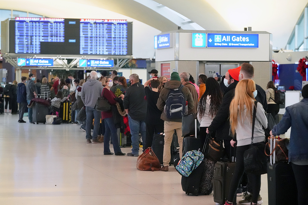 由于奥密克戎变异毒株在美国大范围传播,航空公司因机组和运营人员感染、隔离或辞职,出现岗位人手短缺现象,加上近日美国多地遭遇极端天气,迫使多家航空公司在旅行高峰期间航班延误或者取消。美国达美航空公司和捷蓝航空公司26日分别取消100多架次航班。图片来源:视觉中国