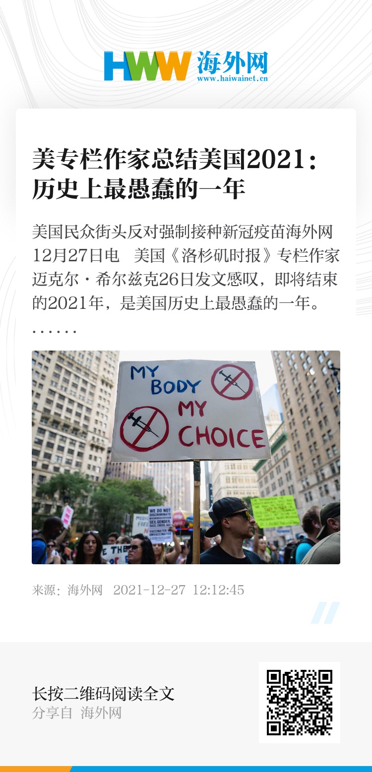 海外网12月27日电 美国《洛杉矶时报》专栏作家迈克尔·希尔兹克26日发文感叹,即将结束的2021年,是美国历史上最愚蠢的一年。
