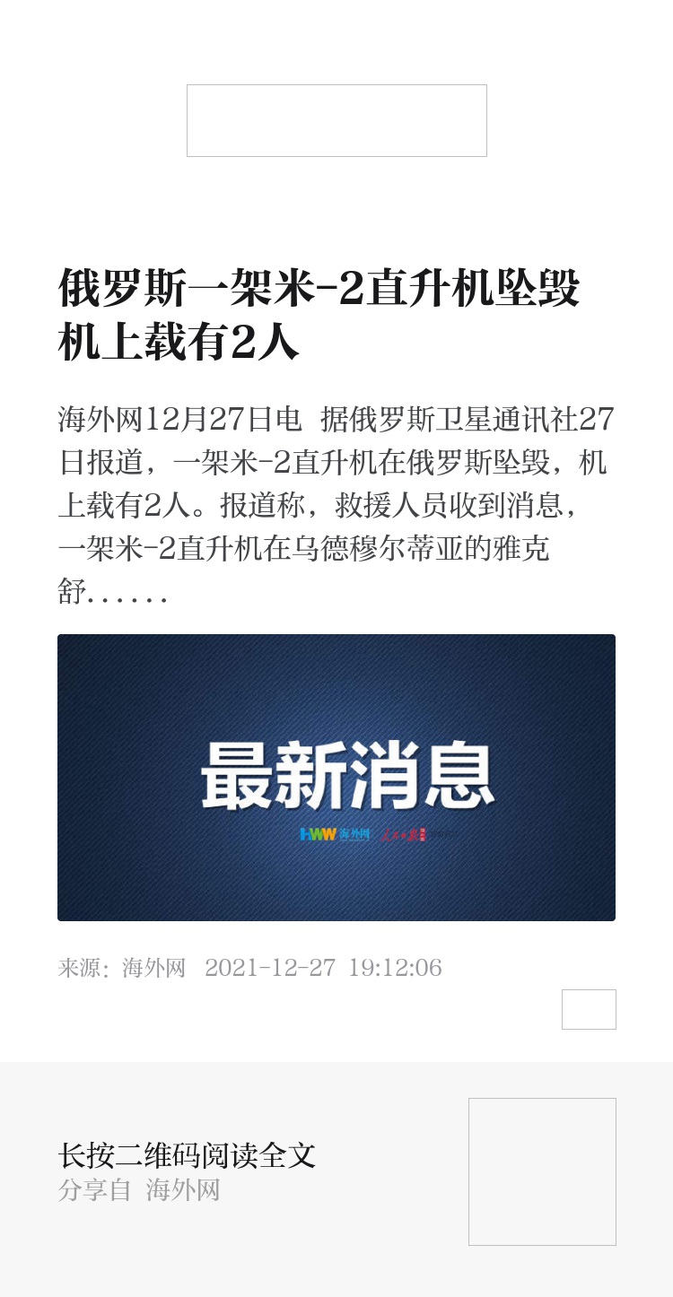 海外网12月27日电 据俄罗斯卫星通讯社27日报道,一架米-2直升机在俄罗斯坠毁,机上载有2人。