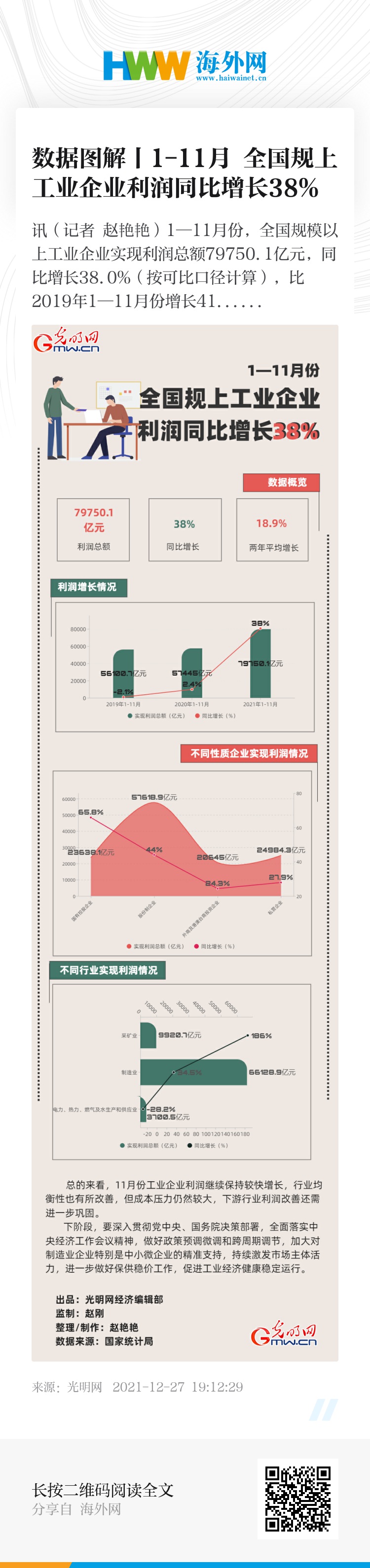 光明网讯(记者 赵艳艳)1—11月份,全国规模以上工业企业实现利润总额79750.1亿元,同比增长38.0%(按可比口径计算),比2019年1—11月份增长41.3%,两年平均增长18.9%。