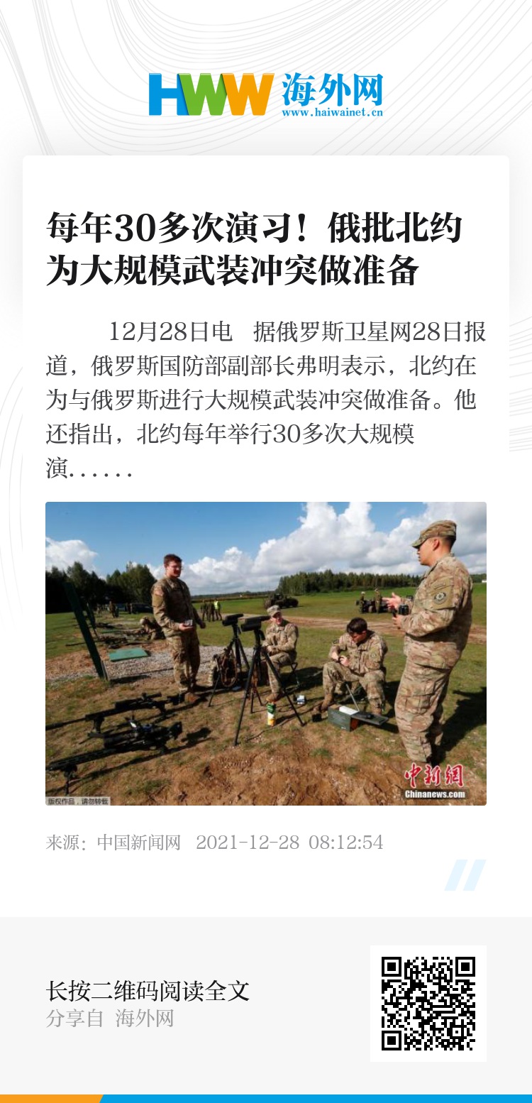中新网12月28日电 据俄罗斯卫星网28日报道,俄罗斯国防部副部长弗明表示,北约在为与俄罗斯进行大规模武装冲突做准备。他还指出,北约每年举行30多次大规模演习,旨在演练针对俄罗斯的战争。