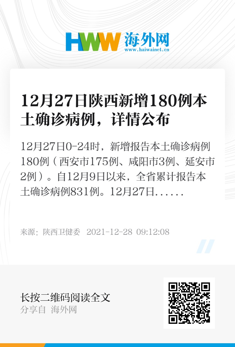12月27日0-24时,新增报告本土确诊病例180例(西安市175例、咸阳市3例、延安市2例)。自12月9日以来,全省累计报告本土确诊病例831例。