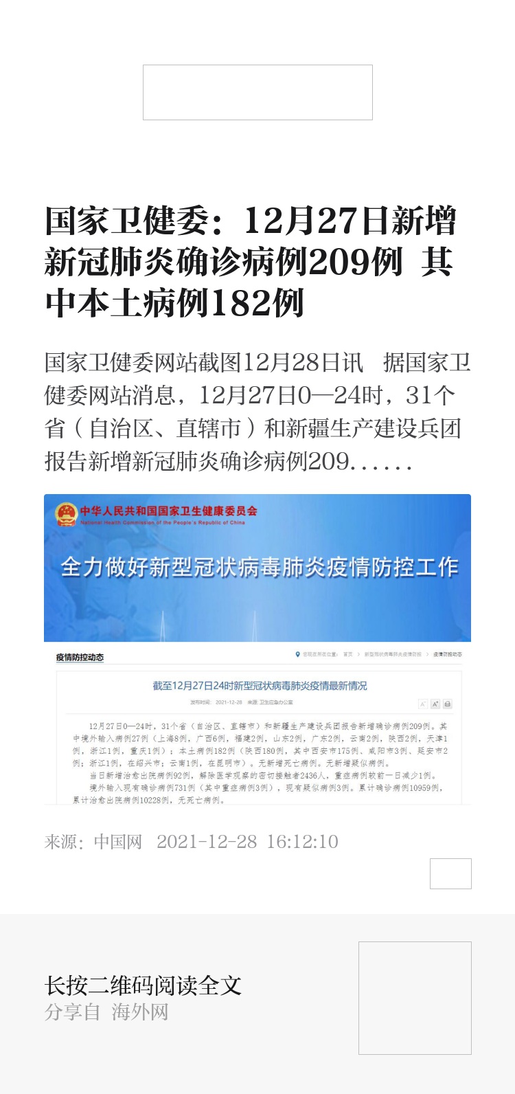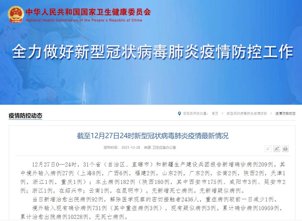 中国网12月28日讯 据国家卫健委网站消息,12月27日0—24时,31个省(自治区、直辖市)和新疆生产建设兵团报告新增新冠肺炎确诊病例209例。其中境外输入病例27例(上海8例,广西6例,福建2例,山东2例,广东2例,云南2例,陕西2例,天津1例,浙江1例,重庆1例);本土病例182例(陕西180例,其中西安市175例、咸阳市3例、延安市2例;浙江1例,在绍兴市;云南1例,在昆明市)。无新增死亡病例。无新增疑似病例。