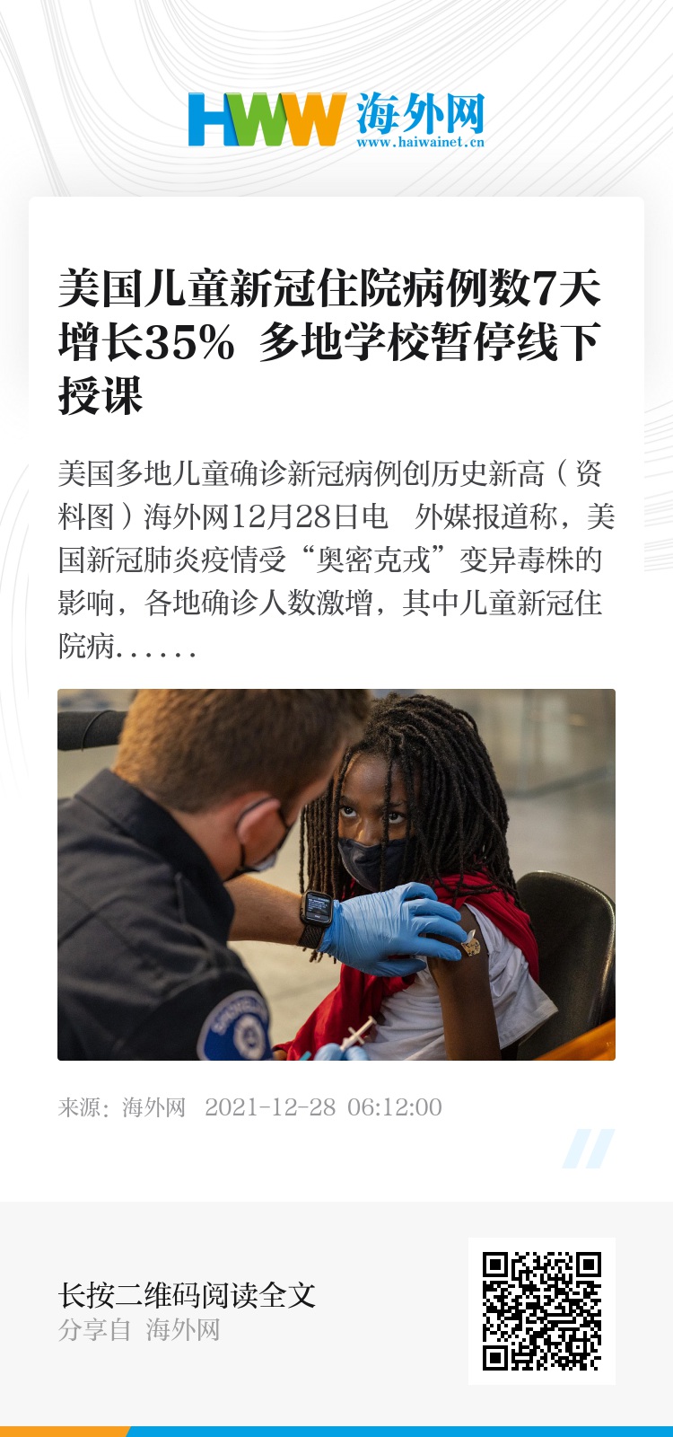 海外网12月28日电 外媒报道称,美国新冠肺炎疫情受“奥密克戎”变异毒株的影响,各地确诊人数激增,其中儿童新冠住院病例数比前一周增长35%。部分地区学校暂停线下授课,有的美国学校负责人表示,当前的疫情形势有如去年情况重现。