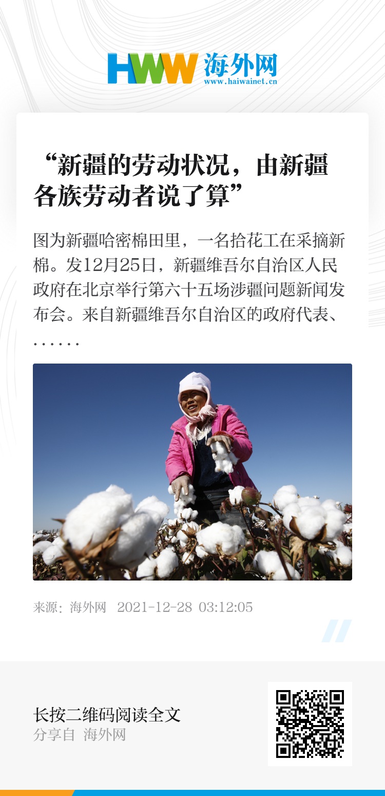 12月25日,新疆维吾尔自治区人民政府在北京举行第六十五场涉疆问题新闻发布会。来自新疆维吾尔自治区的政府代表、有关专家学者和部分群众用事实真相证明,所谓新疆“强迫劳动”问题完全是美西方反华势力制造的谎言,美西方反华势力企图借此剥夺新疆各族群众通过劳动和就业追求美好生活的权利,遏制新疆稳定发展。