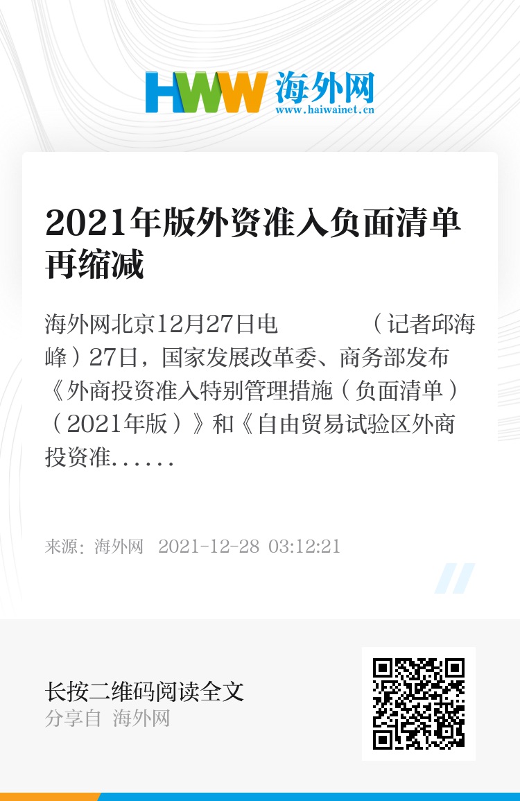 海外网北京12月27日电 (记者邱海峰)27日,国家发展改革委、商务部发布《外商投资准入特别管理措施(负面清单)(2021年版)》和《自由贸易试验区外商投资准入特别管理措施(负面清单)(2021年版)》。2021年版全国和自贸试验区外资准入负面清单进一步缩减至31条、27条,压减比例分别为6.1%、10%。