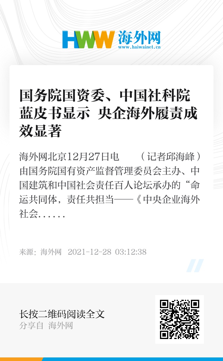 海外网北京12月27日电 (记者邱海峰)由国务院国有资产监督管理委员会主办、中国建筑和中国社会责任百人论坛承办的“命运共同体,责任共担当——《中央企业海外社会责任蓝皮书(2021)》发布会”日前在京举行。会上,国务院国资委、中国社科院发布的蓝皮书显示,中央企业在不断拓展国际业务、提升国际化水平的同时,持续加强海外履责,在积极助力全球抗疫、高水平参与共建“一带一路”、大力支持全球减贫事业等方面成效显著。