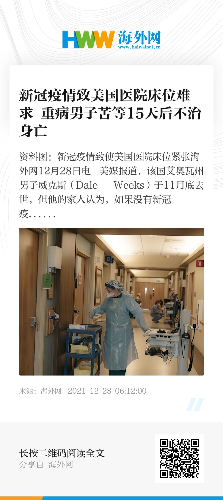 海外网12月28日电 美媒报道,该国艾奥瓦州男子威克斯(Dale Weeks)于11月底去世,但他的家人认为,如果没有新冠疫情的再次大规模暴发,威克斯可能就不会死。