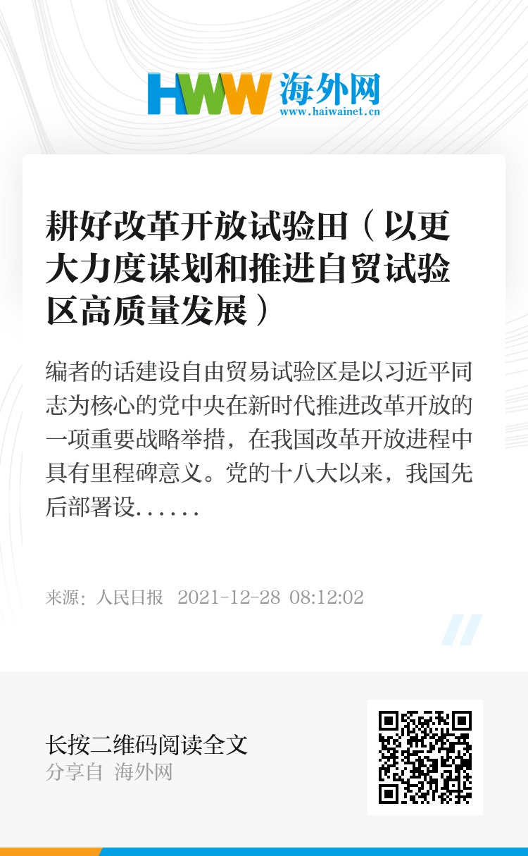 “赋予自由贸易试验区更大改革自主权,探索建设自由贸易港。”“中国将支持自由贸易试验区深化改革创新,持续深化差别化探索,加大压力测试,发挥自由贸易试验区改革开放试验田作用。”……党的十八大以来,习近平总书记就自贸试验区建设提出一系列新思想新观点新要求,为自贸试验区建设指明了方向。“十四五”规划纲要提出:“完善自由贸易试验区布局,赋予其更大改革自主权,深化首创性、集成化、差别化改革探索,积极复制推广制度创新成果。”