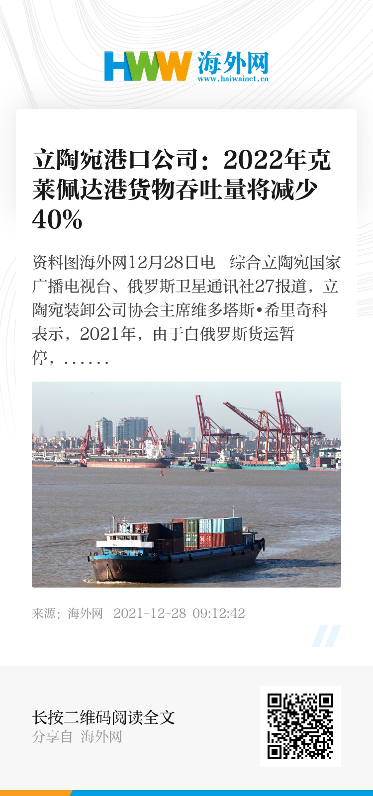 海外网12月28日电 综合立陶宛国家广播电视台、俄罗斯卫星通讯社27报道,立陶宛装卸公司协会主席维多塔斯•希里奇科表示,2021年,由于白俄罗斯货运暂停,立陶宛克莱佩达港损失超4%货物。2022年,加之受立中关系影响,克莱佩达港的货物吞吐量将减少40%。