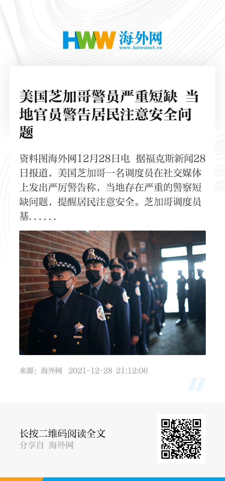 海外网12月28日电 据福克斯新闻28日报道,美国芝加哥一名调度员在社交媒体上发出严厉警告称,当地存在严重的警察短缺问题,提醒居民注意安全。