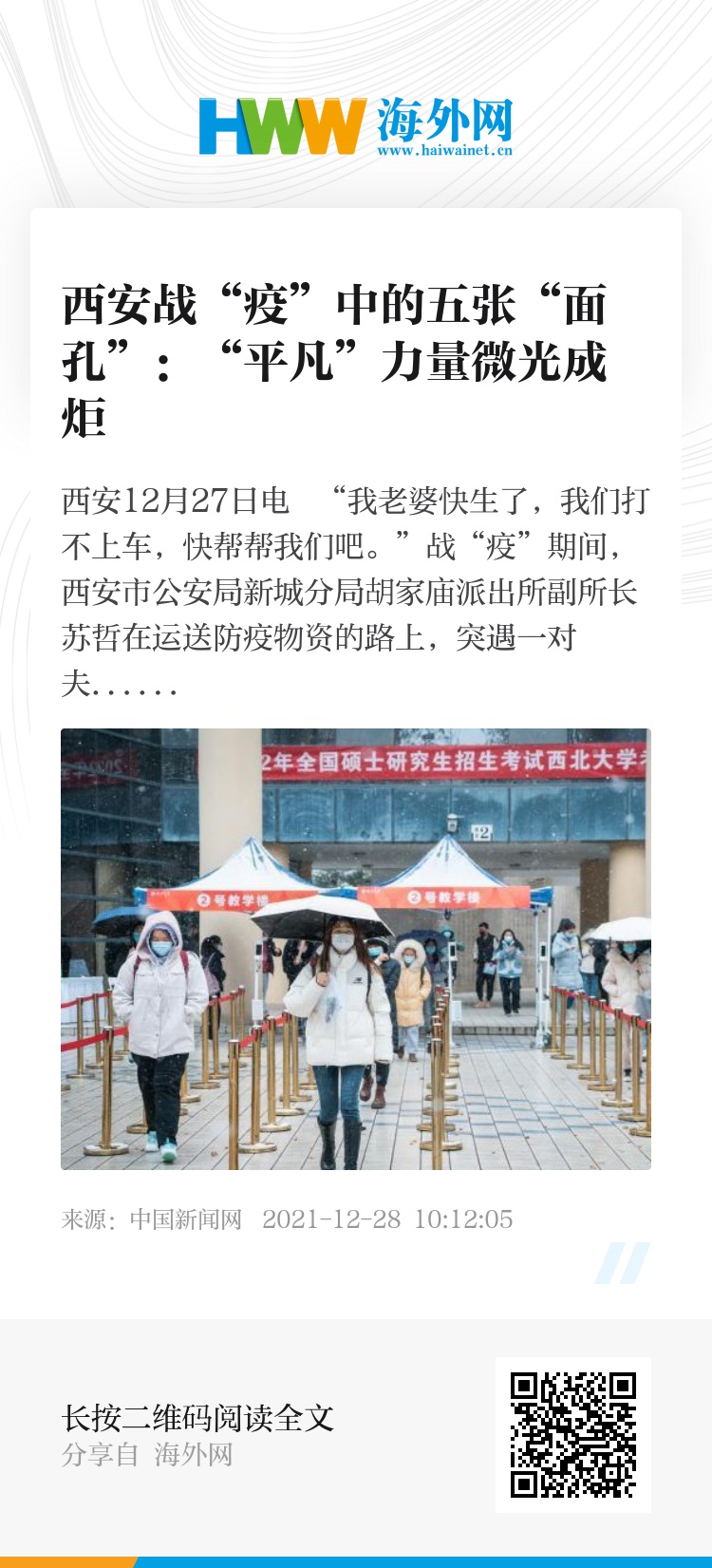 当前,西安市疫情防控形势严峻复杂,对研考造成巨大影响。面对复杂又艰巨的组考工作,西安各考点的师生与工作人员,筑起“战疫防线”确保考生“应考尽考”。