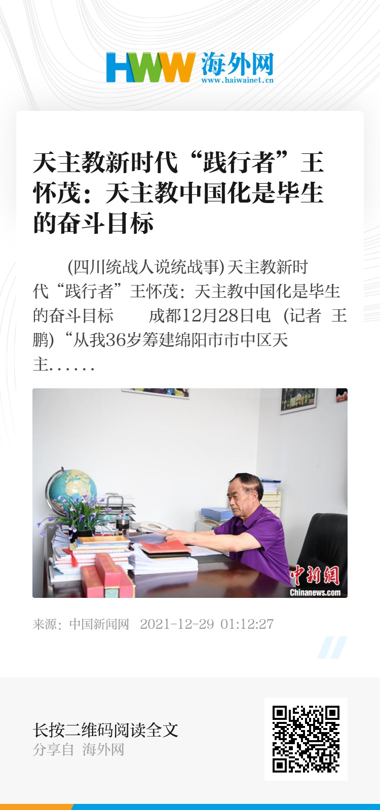 中新网成都12月28日电 (记者 王鹏)“从我36岁筹建绵阳市市中区天主教爱国会算起,我已经在天主教爱国会工作了近40年,大半生都在致力于天主教中国化。”近日,75岁的四川省天主教爱国会和四川省天主教教务委员会(简称四川省天主教“两会”)副主席兼秘书长王怀茂在成都接受采访时表示,天主教中国化是自己毕生的奋斗目标。