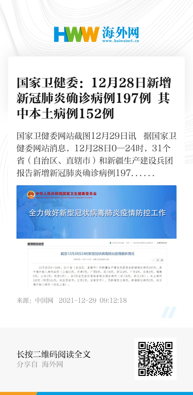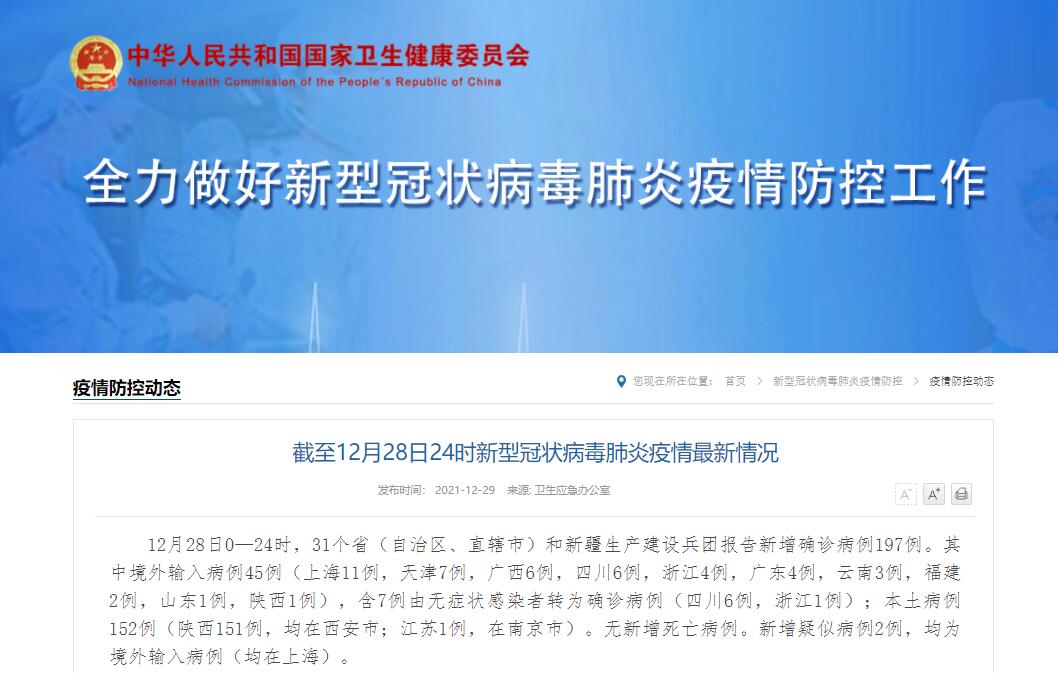 中国网12月29日讯 据国家卫健委网站消息,12月28日0—24时,31个省(自治区、直辖市)和新疆生产建设兵团报告新增新冠肺炎确诊病例197例。其中境外输入病例45例(上海11例,天津7例,广西6例,四川6例,浙江4例,广东4例,云南3例,福建2例,山东1例,陕西1例),含7例由无症状感染者转为确诊病例(四川6例,浙江1例);本土病例152例(陕西151例,均在西安市;江苏1例,在南京市)。无新增死亡病例。新增疑似病例2例,均为境外输入病例(均在上海)。