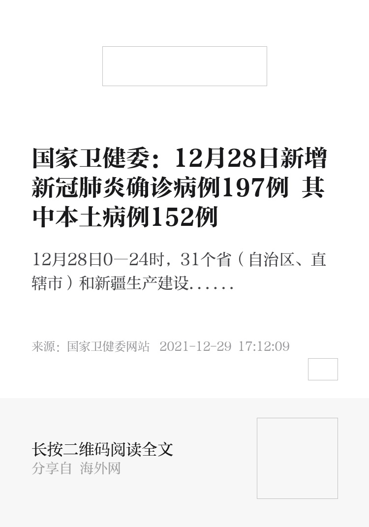 12月28日0―24时,31个省(自治区、直辖市)和新疆生产建设兵团报告新增确诊病例197例。其中境外输入病例45例(上海11例,天津7例,广西6例,四川6例,浙江4例,广东4例,云南3例,福建2例,山东1例,陕西1例),含7例由无症状感染者转为确诊病例(四川6例,浙江1例);本土病例152例(陕西151例,均在西安市;江苏1例,在南京市)。无新增死亡病例。新增疑似病例2例,均为境外输入病例(均在上海)。