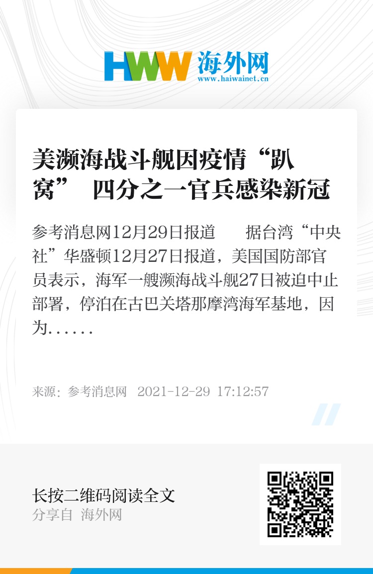 参考消息网12月29日报道 据台湾“中央社”华盛顿12月27日报道,美国国防部官员表示,海军一艘濒海战斗舰27日被迫中止部署,停泊在古巴关塔那摩湾海军基地,因为船上20多名官兵的新冠检测呈阳性,约占全船总人数的四分之一。