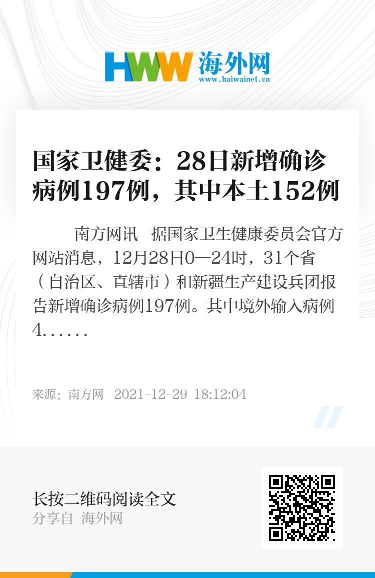 南方网讯 据国家卫生健康委员会官方网站消息,12月28日0—24时,31个省(自治区、直辖市)和新疆生产建设兵团报告新增确诊病例197例。其中境外输入病例45例(上海11例,天津7例,广西6例,四川6例,浙江4例,广东4例,云南3例,福建2例,山东1例,陕西1例),含7例由无症状感染者转为确诊病例(四川6例,浙江1例);本土病例152例(陕西151例,均在西安市;江苏1例,在南京市)。无新增死亡病例。新增疑似病例2例,均为境外输入病例(均在上海)。