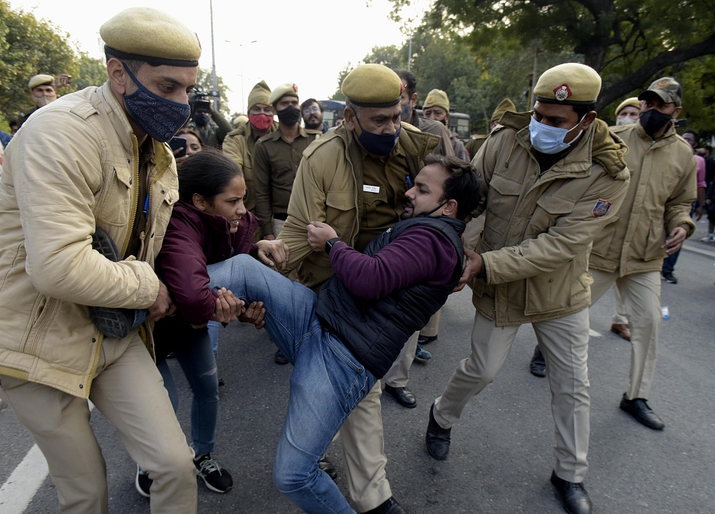 当地时间12月27日,印度首都新德里,大批医生上街游行,对涉及医学生的一项考试后续流程被推迟表达不满。然而,医生们的游行被警方阻止,双方还爆发激烈对峙,多名女医生称遭到粗暴对待。对此,有医生团体呼吁各地医生,从29日起全面暂停医疗服务。图片来源:人民视觉