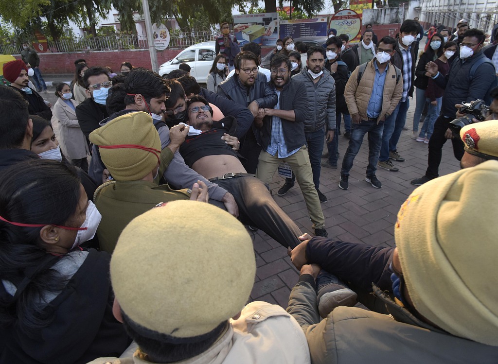 当地时间12月27日,印度首都新德里,大批医生上街游行,对涉及医学生的一项考试后续流程被推迟表达不满。然而,医生们的游行被警方阻止,双方还爆发激烈对峙,多名女医生称遭到粗暴对待。对此,有医生团体呼吁各地医生,从29日起全面暂停医疗服务。图片来源:人民视觉