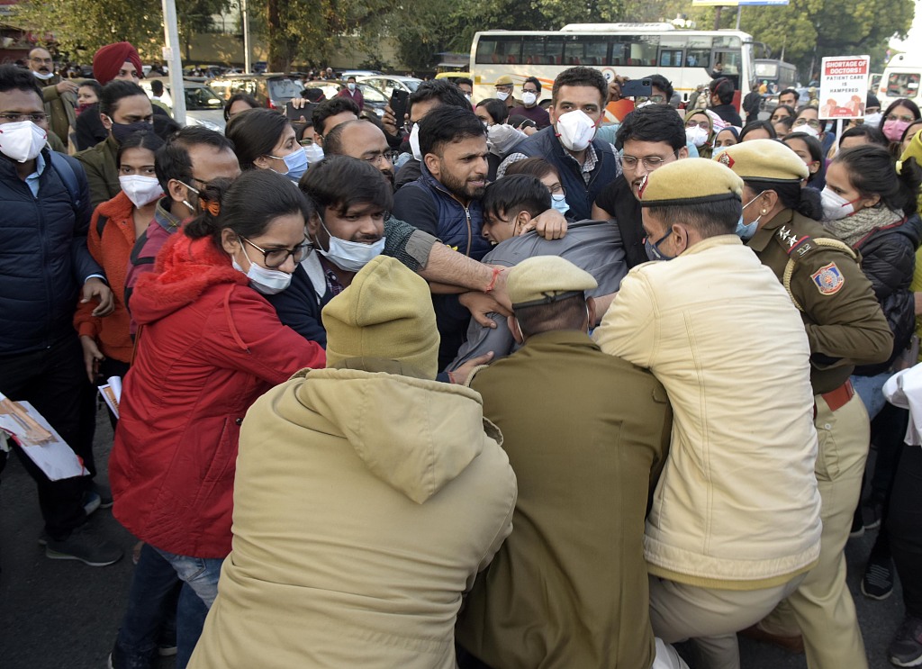 当地时间12月27日,印度首都新德里,大批医生上街游行,对涉及医学生的一项考试后续流程被推迟表达不满。然而,医生们的游行被警方阻止,双方还爆发激烈对峙,多名女医生称遭到粗暴对待。对此,有医生团体呼吁各地医生,从29日起全面暂停医疗服务。图片来源:人民视觉