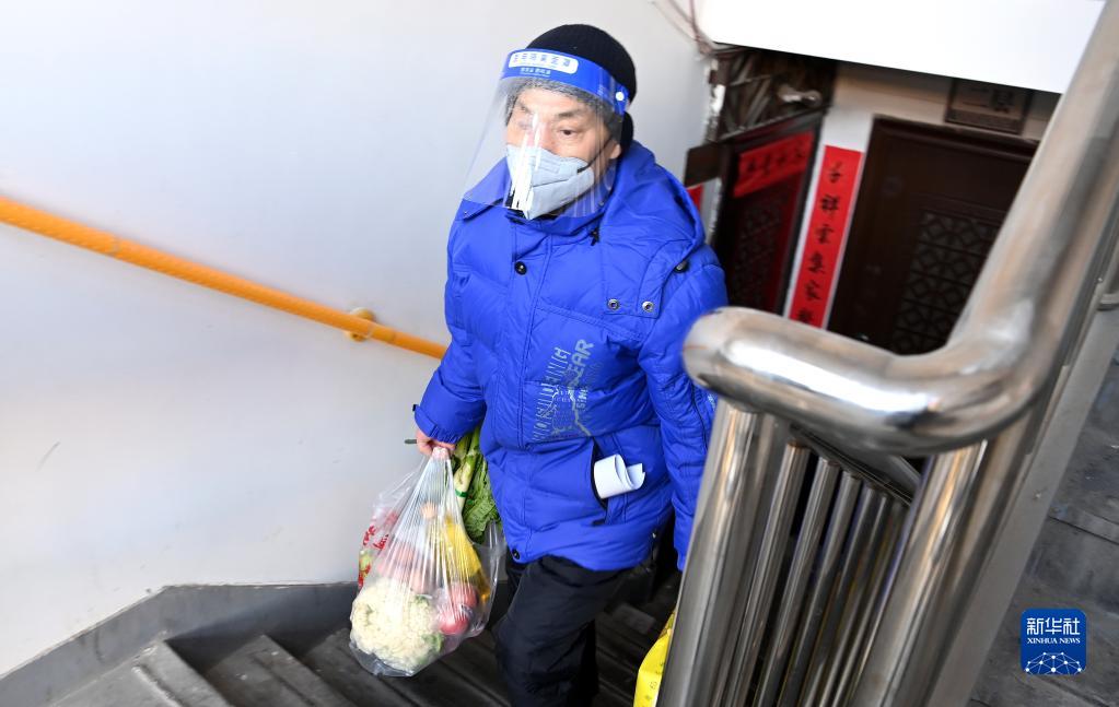 12月29日,在西安市新城区西一路街道通济北坊十一号院,居民将领取到的免费生活物资带回家。新华社记者 刘潇 摄
