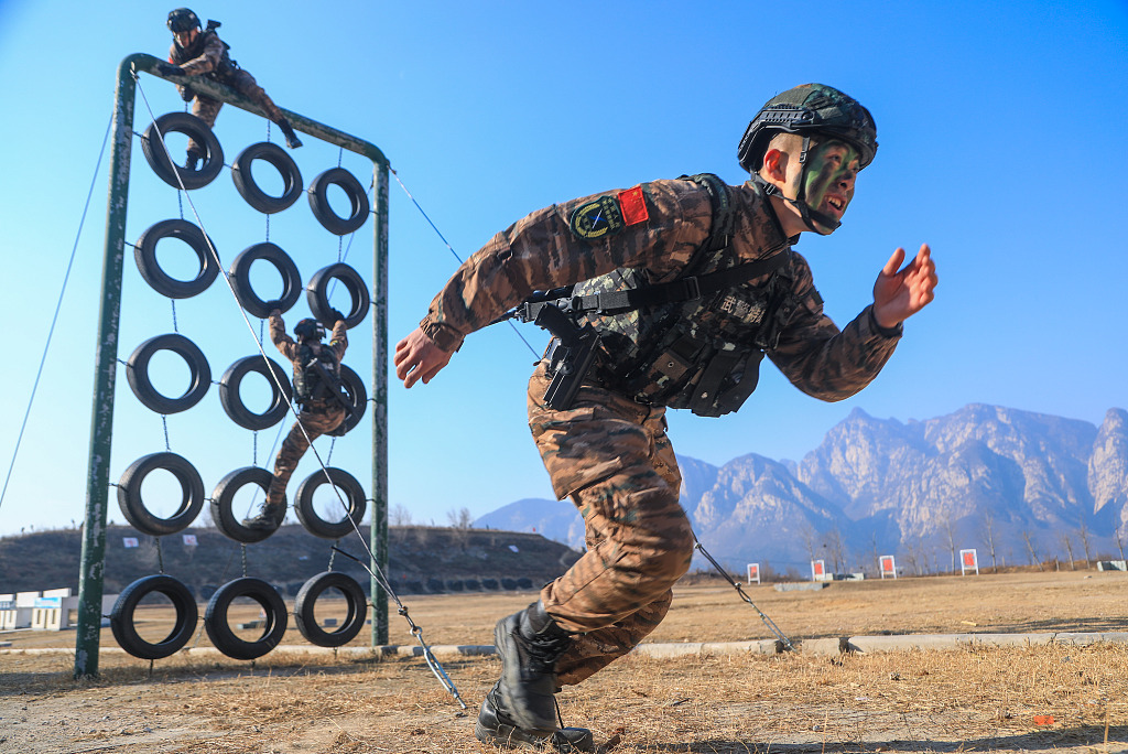 12月29日,郑州,武警第一机动总队某支队组织侦察队员开展300米障碍训练。图片来源:人民视觉