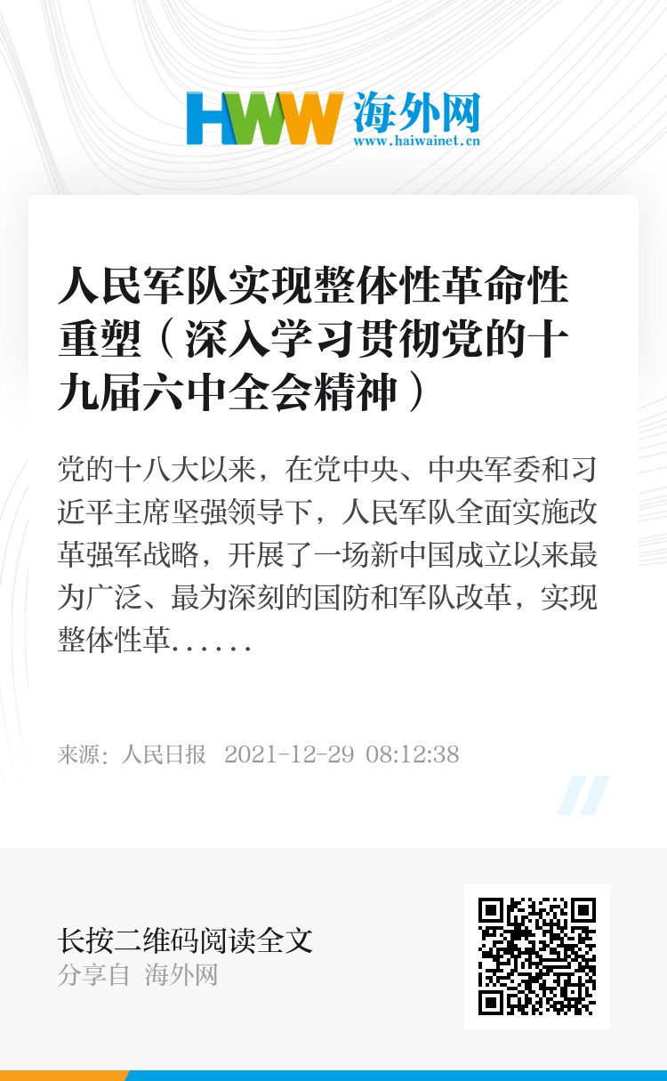 党的十八大以来,在党中央、中央军委和习近平主席坚强领导下,人民军队全面实施改革强军战略,开展了一场新中国成立以来最为广泛、最为深刻的国防和军队改革,实现整体性革命性重塑。党的十九届六中全会通过的《中共中央关于党的百年奋斗重大成就和历史经验的决议》,充分肯定深化国防和军队改革取得的历史性成就,对于动员全党全军聚力推进改革强军,奋力实现党在新时代的强军目标、把人民军队全面建成世界一流军队,具有重大而深远的意义。