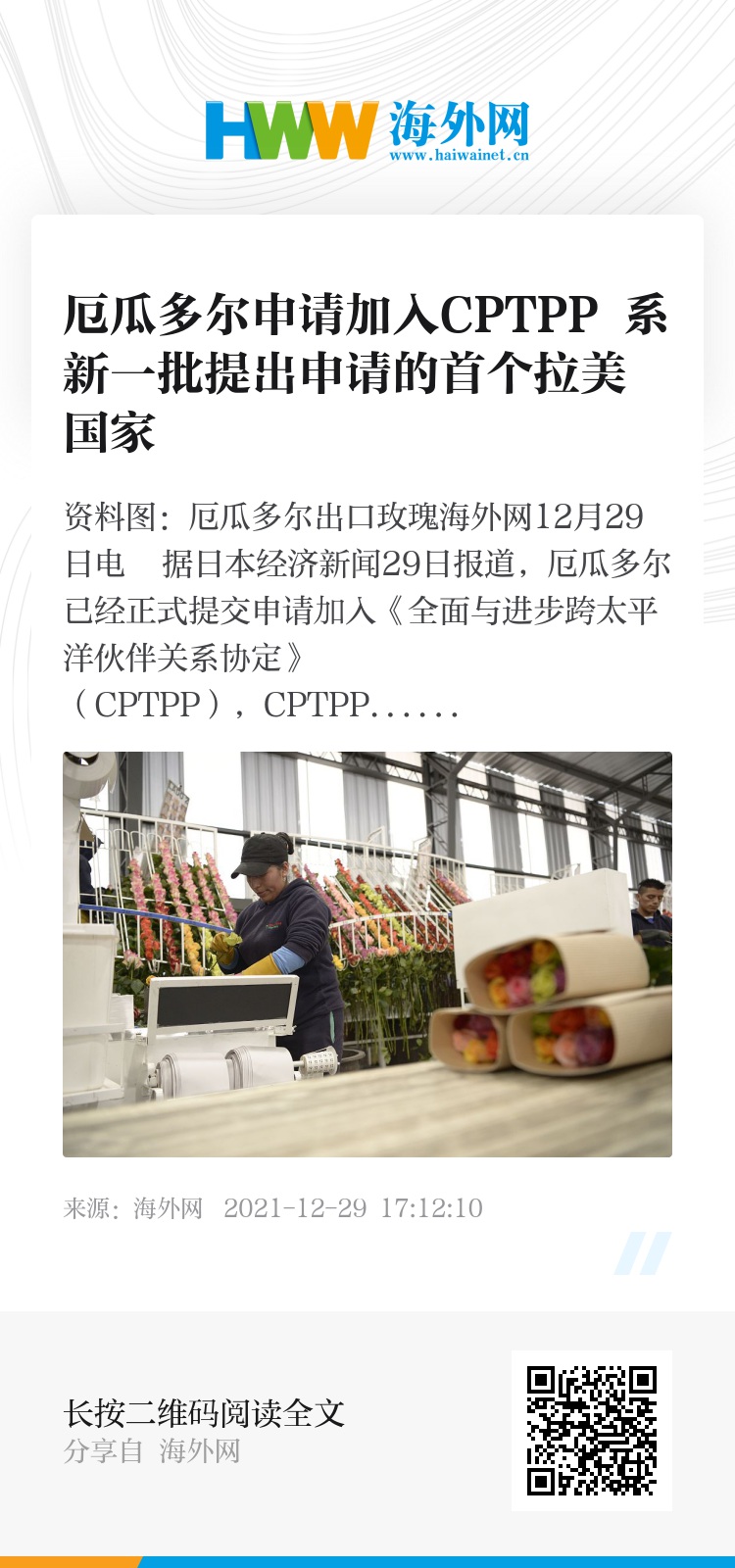海外网12月29日电 据日本经济新闻29日报道,厄瓜多尔已经正式提交申请加入《全面与进步跨太平洋伙伴关系协定》(CPTPP),CPTPP保存方新西兰接受信函并将与其他成员国对此进行评估。