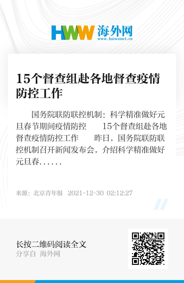 昨日,国务院联防联控机制召开新闻发布会,介绍科学精准做好元旦春节期间疫情防控有关情况。国家卫生健康委员会新闻发言人米锋在昨天的发布会上透露,国务院联防联控机制近日组建了15个督查组,对全国31个省份及新疆生产建设兵团开展元旦春节期间疫情防控工作综合督查。