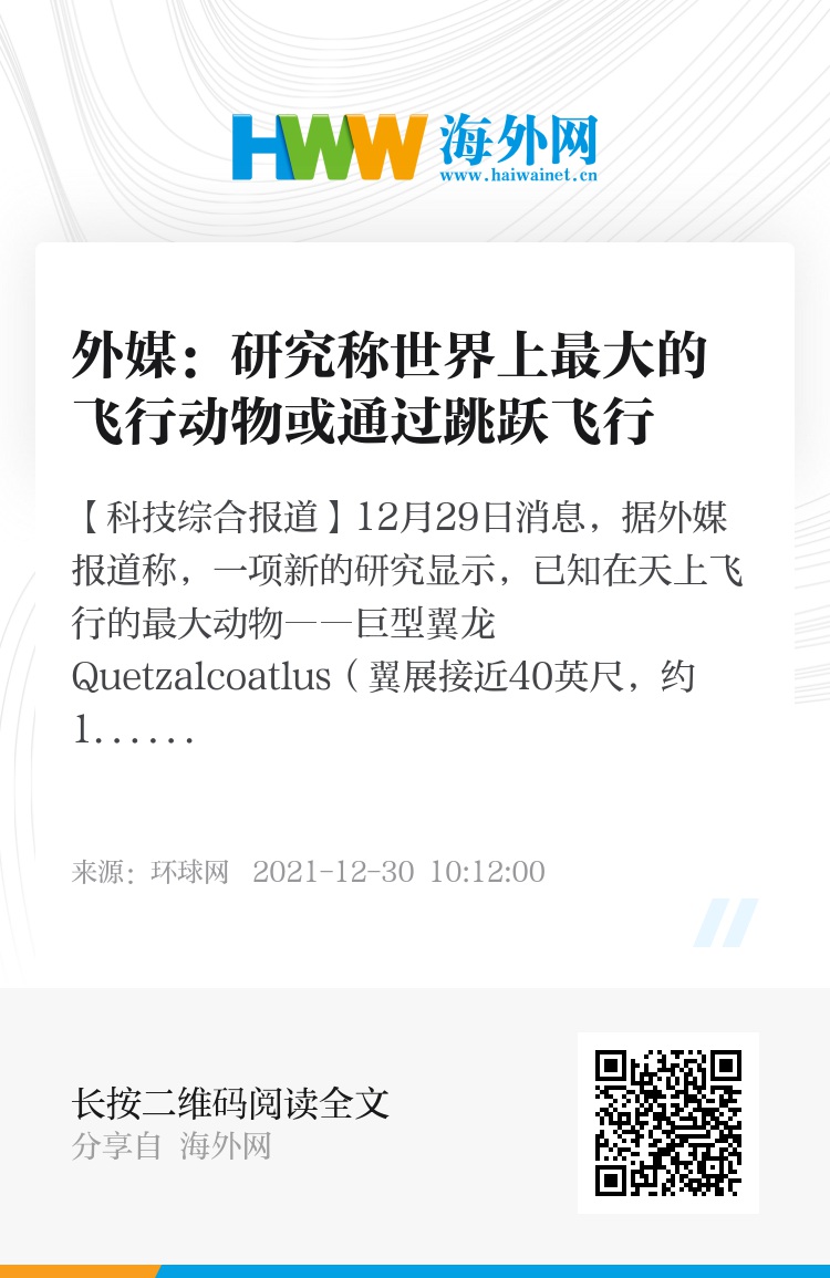 【环球网科技综合报道】12月29日消息,据外媒报道称,一项新的研究显示,已知在天上飞行的最大动物――巨型翼龙Quetzalcoatlus(翼展接近40英尺,约12米),这种猛犸象几倍的生物可能采用的是跳跃式飞行,它至少跳到8英尺(约2.4米)高的空中,然后通过振翅起飞。