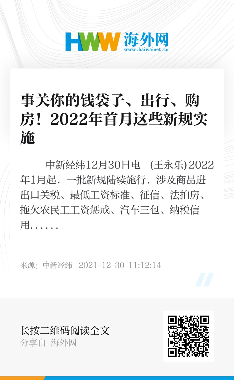 中新经纬12月30日电 (王永乐)2022年1月起,一批新规陆续施行,涉及商品进出口关税、最低工资标准、征信、法拍房、拖欠农民工工资惩戒、汽车三包、纳税信用修复、铁路列车运行图、招聘等等,哪一项对你生活影响最大?
