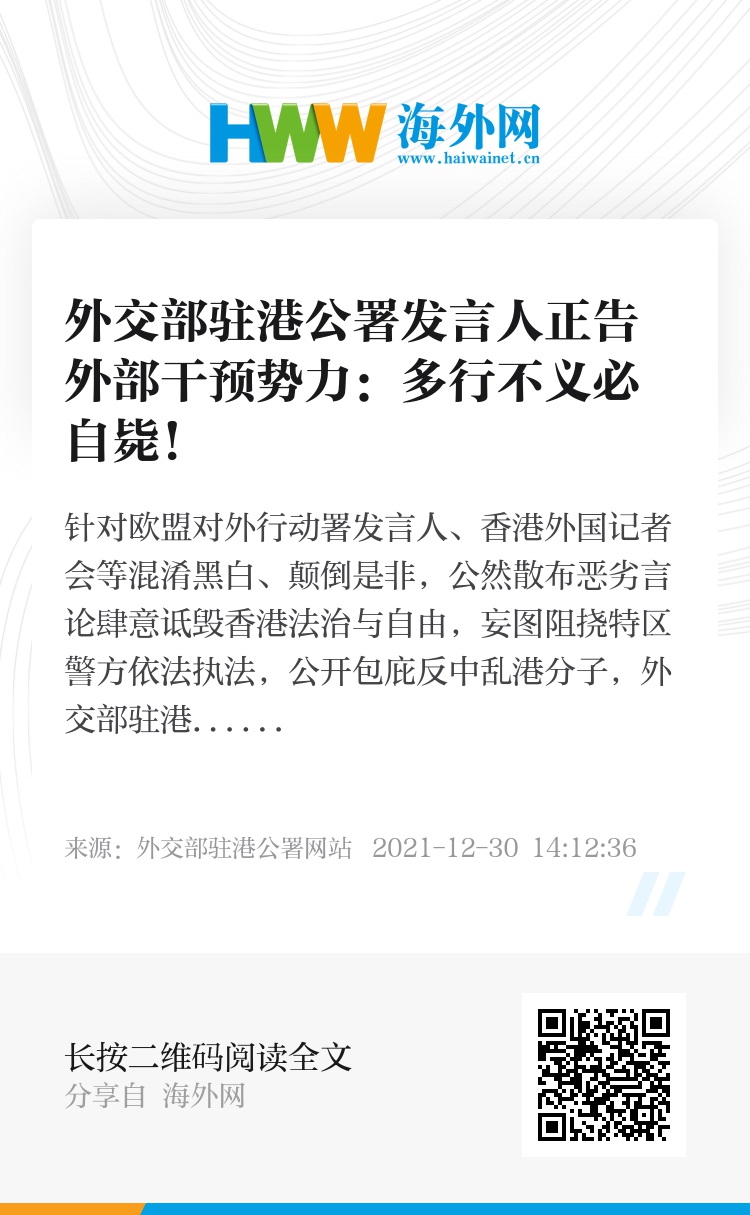 针对欧盟对外行动署发言人、香港外国记者会等混淆黑白、颠倒是非,公然散布恶劣言论肆意诋毁香港法治与自由,妄图阻挠特区警方依法执法,公开包庇反中乱港分子,外交部驻港公署发言人表示强烈不满和坚决反对,指出香港拨乱反正的历史大势不可阻挡,任何外部干预抹黑都如螳臂挡车,不自量力,注定失败!