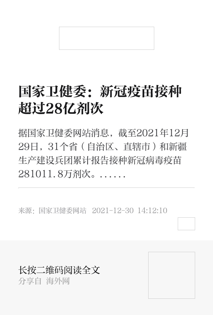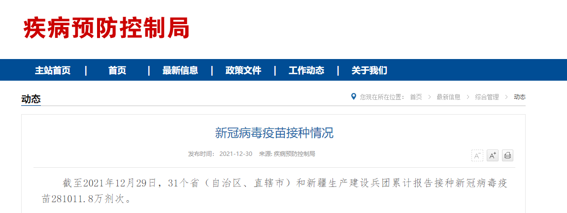 据国家卫健委网站消息,截至2021年12月29日,31个省(自治区、直辖市)和新疆生产建设兵团累计报告接种新冠病毒疫苗281011.8万剂次。