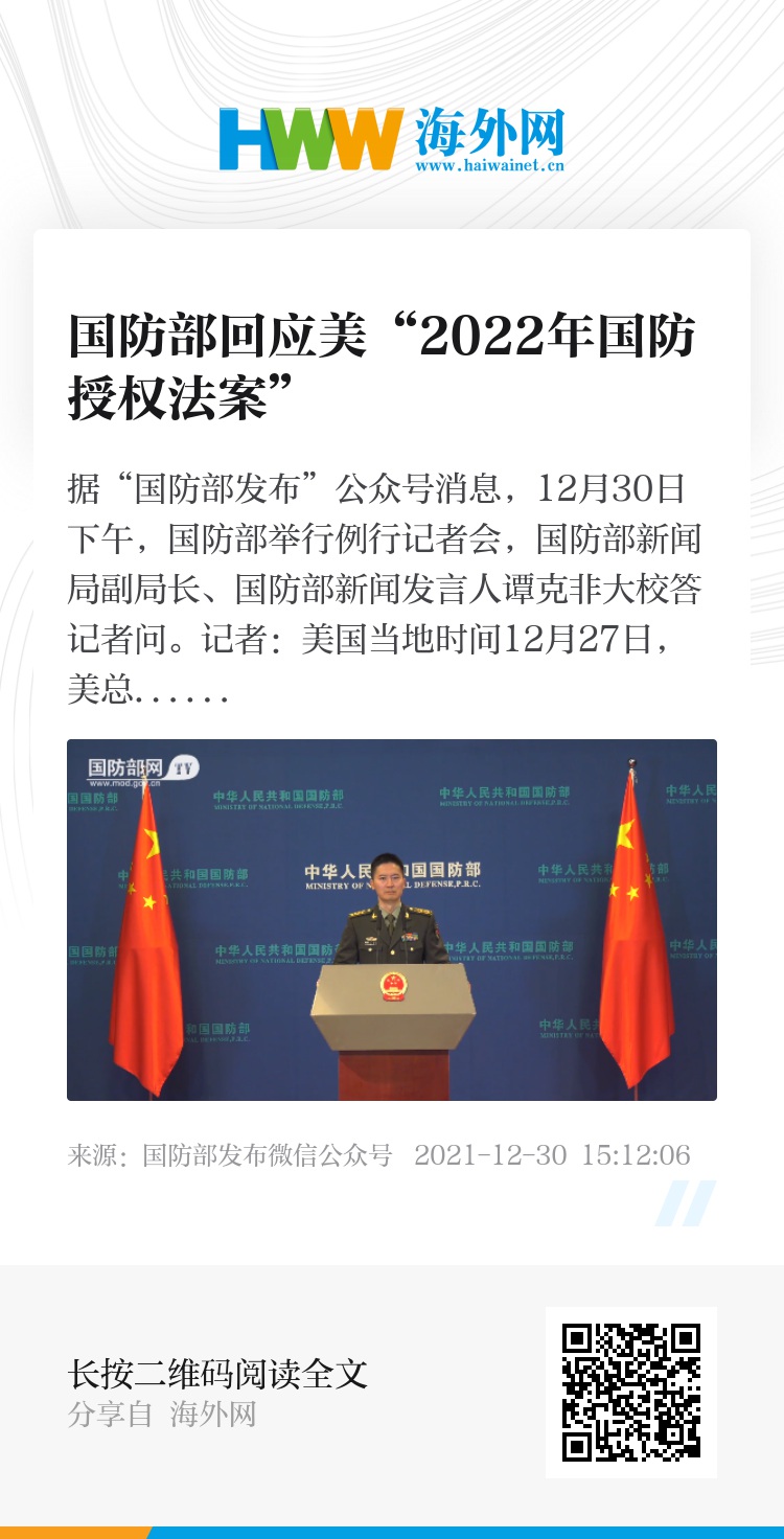 谭克非:美近日出台包含多项涉华消极条款的“2022年国防授权法案”。该法案充斥冷战思维和意识形态偏见,渲染“中国威胁论”,极力抹黑中国国防政策和军力发展,在台湾、涉疆等问题上对中方无端指责,鼓噪在亚太、拉美等地区加强对华遏制,煽动开展对华经贸、科技竞争,诋毁中国同有关国家正常交流合作。该法案严重干涉中国内政,严重损害中国国家主权、安全、发展利益,严重损害中美互信,严重毒化中美两国两军关系,中方对此表示强烈不满和坚决反对。
