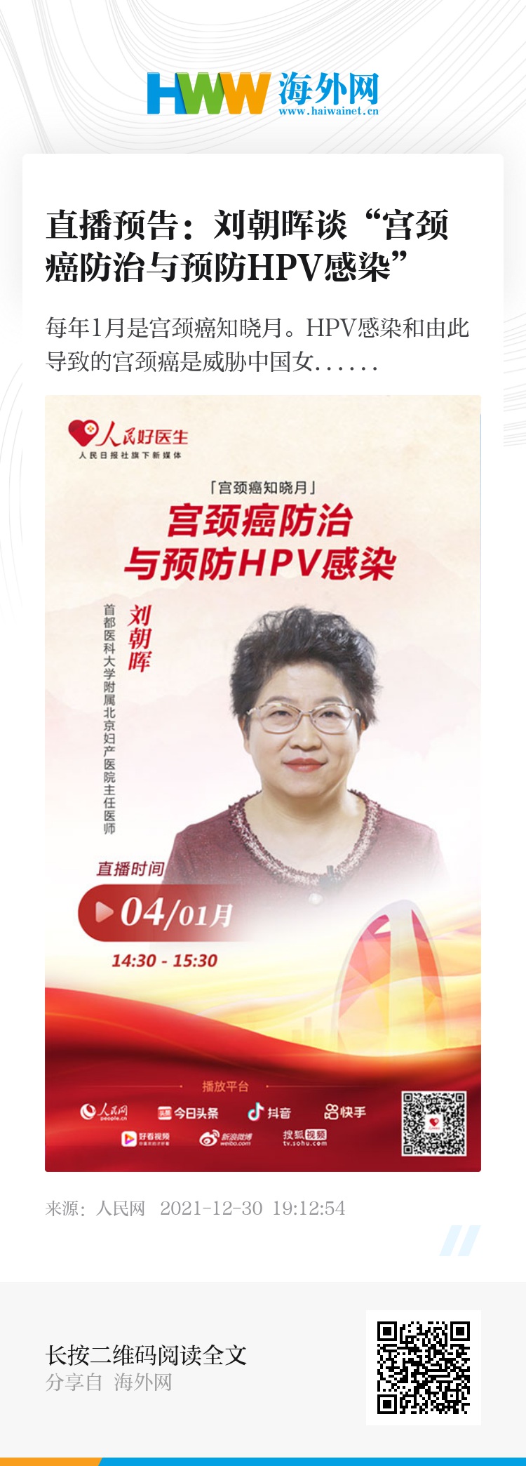 2022年1月4日14:30至15:30,首都医科大学附属北京妇产医院主任医师刘朝晖将做客人民日报社旗下新媒体“人民好医生”客户端,就“宫颈癌防治与预防HPV感染”主题进行科普,欢迎届时收看。