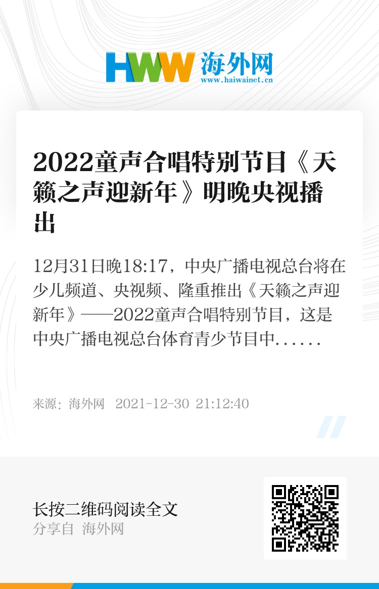 12月31日晚18:17,中央广播电视总台将在少儿频道、央视频、央视网隆重推出《天籁之声迎新年》——2022童声合唱特别节目,这是中央广播电视总台体育青少节目中心发起制作的新年童声合唱活动。《天籁之声迎新年》以“小切口、大主题”方式,以寻找“天籁之声”为主线,呈现感人励志音乐作品和打动人心的小故事。通过这些有爱心、有温度的节目,传递时代精神,展现国家进步与民族富强,突显今天和平年代孩子们对大自然的热爱,对美好生活的追求。
