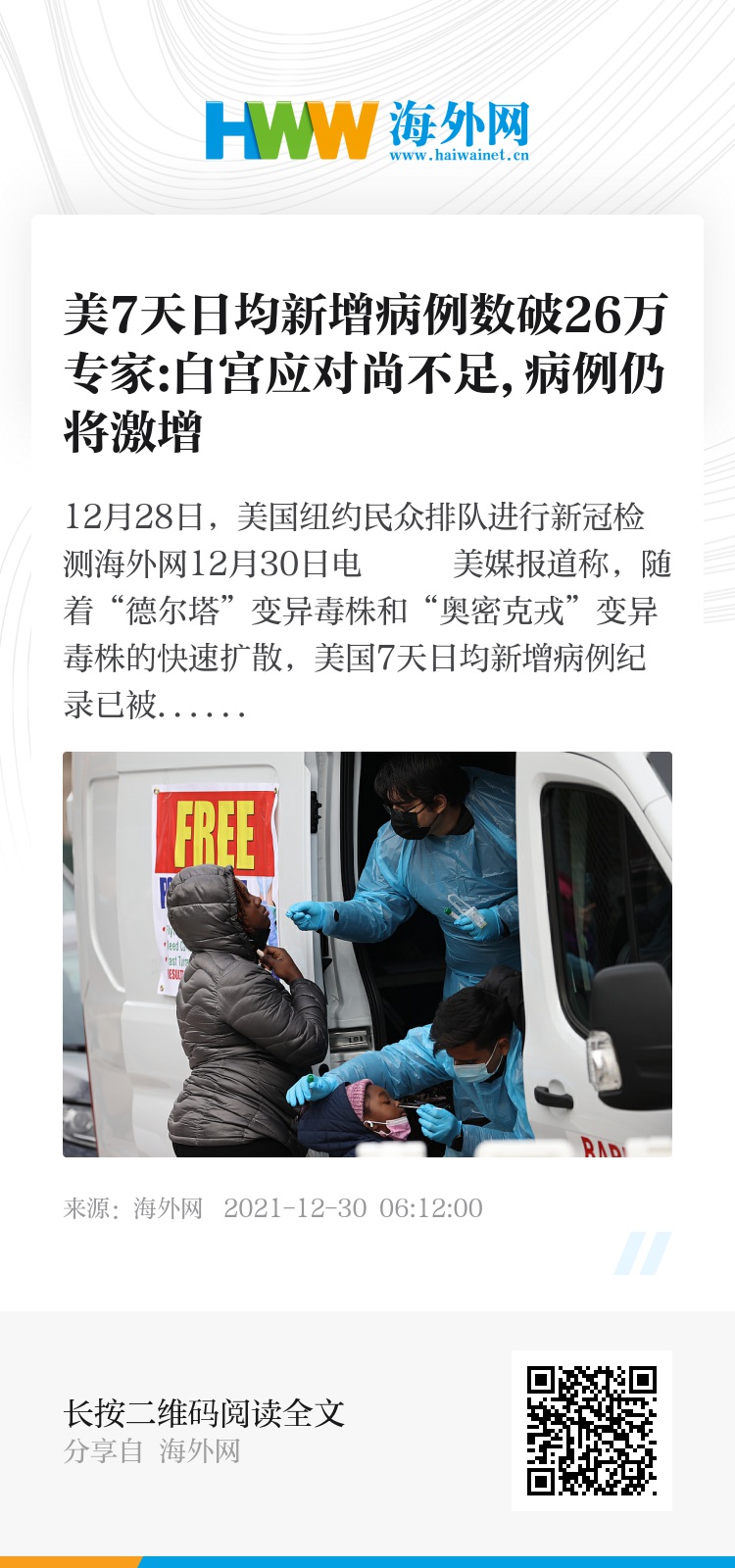 据《纽约时报》28日报道,美国截至28日的7天日均新增病例数超过26.7万,其中首都华盛顿哥伦比亚特区、马里兰州和弗吉尼亚州受到的影响尤其严重。先前美国的平均单日新增确诊纪录是在2021年1月11日创下的,当时7天日均新增25.1万例确诊病例,如今再创新高。伴随着确诊病例数的激增,7天日均住院病例数和死亡病例数也同时增长,分别超过7.1万例和1243例。美国疾控中心指出,“奥密克戎”引起的病例比重明显低于预期,约为59%。对于截至12月18日的那周,该机构将其73%的估计下调至约23%,这意味着更致命的“德尔塔”变异毒株直到本周仍占主导地位。