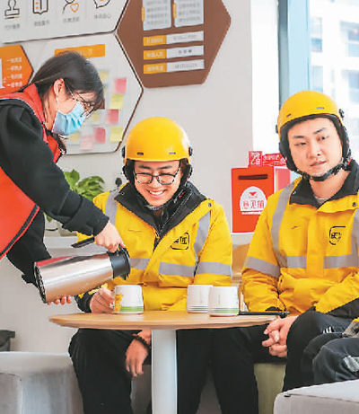 12月17日,浙江省湖州市德清县康乾街道千丰社区志愿者为快递和外卖小哥们提供热水服务。 王树成摄(人民视觉)