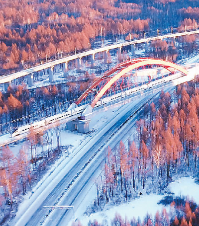 12月24日,沈阳至佳木斯高铁长白山至敦化段正式开通运营。图为试运行期间,高铁列车穿行在沈佳高铁白敦段沿途的长白山风景区林海中。 刘慎库摄(新华社发)