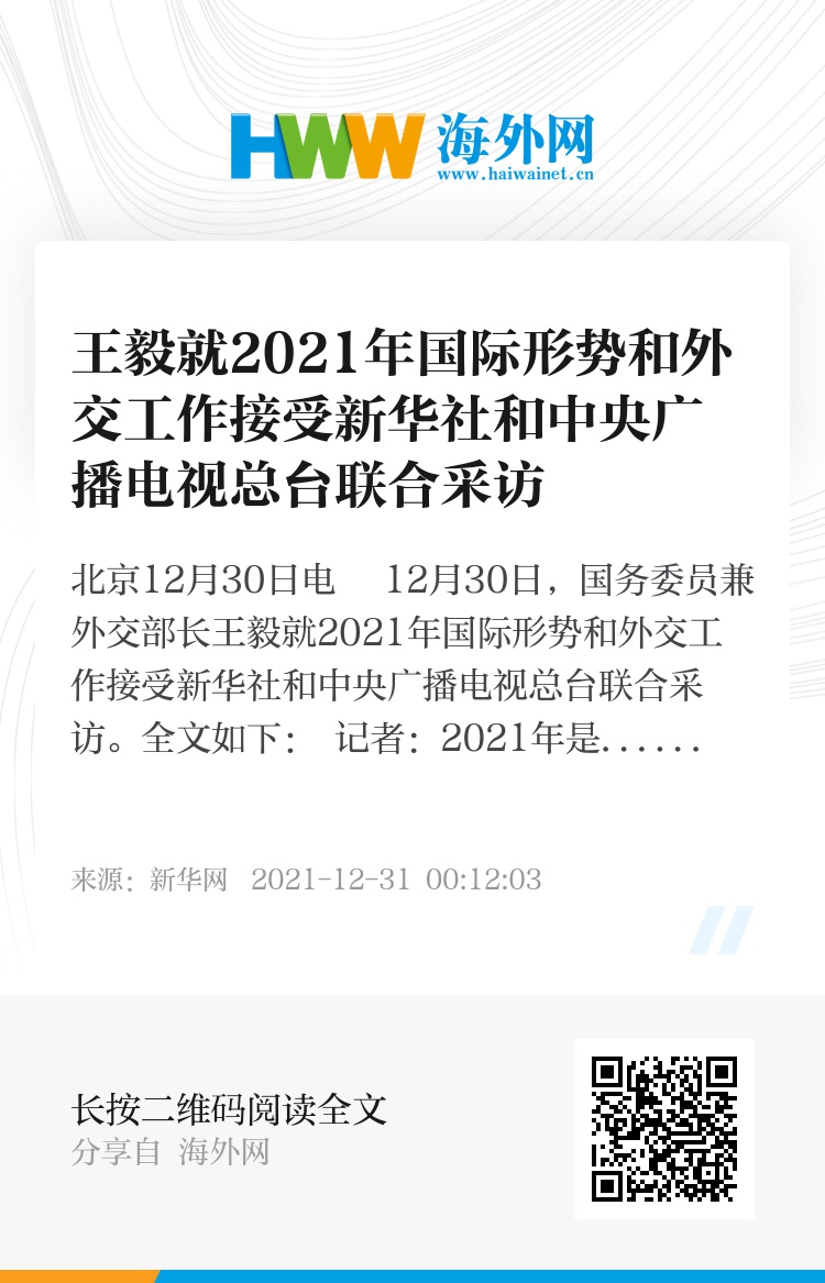 新华社北京12月30日电 12月30日,国务委员兼外交部长王毅就2021年国际形势和外交工作接受新华社和中央广播电视总台联合采访。全文如下: