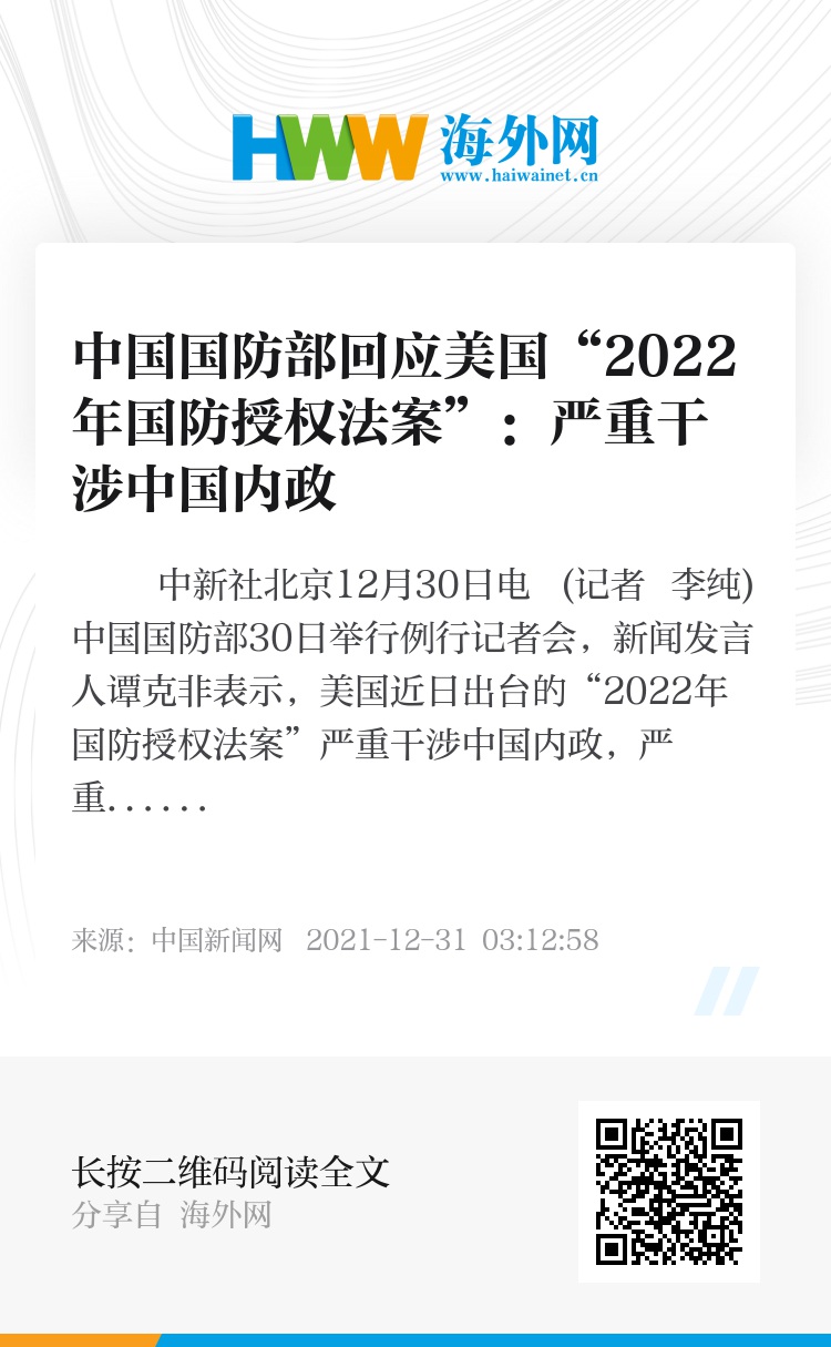 有记者问:美国当地时间12月27日,美总统签署“2022年国防授权法案”,其中包括多项涉华内容,请问发言人对此有何评论?