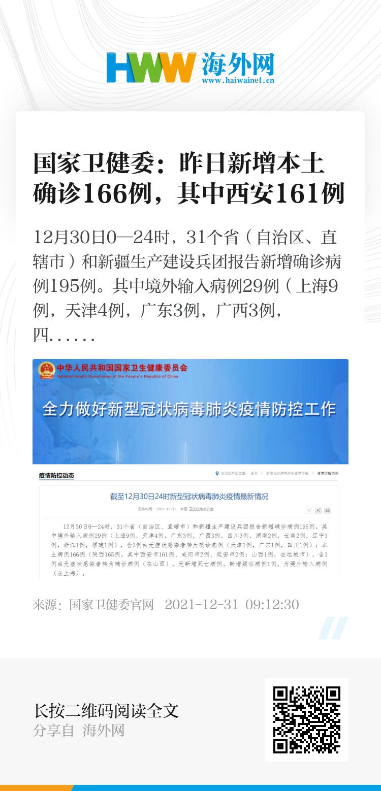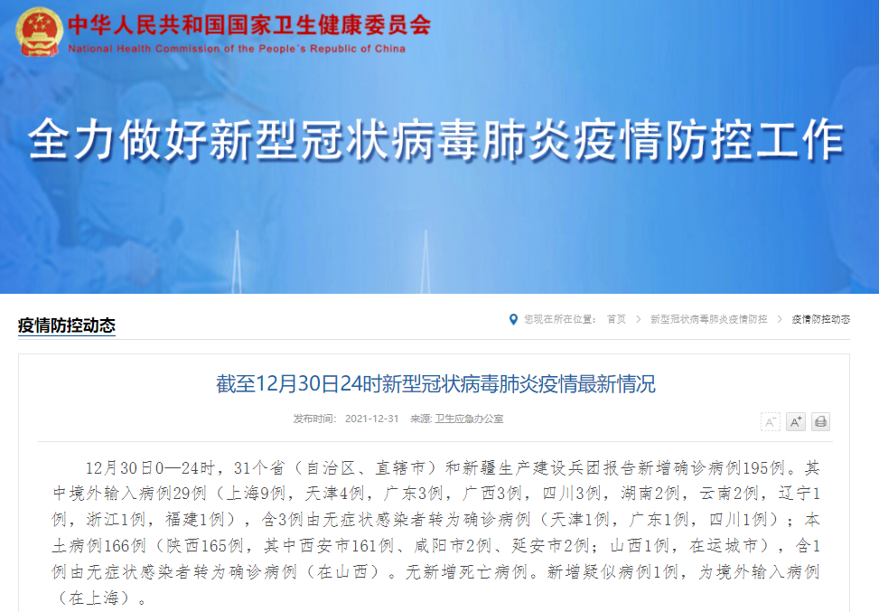 12月30日0—24时,31个省(自治区、直辖市)和新疆生产建设兵团报告新增确诊病例195例。其中境外输入病例29例(上海9例,天津4例,广东3例,广西3例,四川3例,湖南2例,云南2例,辽宁1例,浙江1例,福建1例),含3例由无症状感染者转为确诊病例(天津1例,广东1例,四川1例);本土病例166例(陕西165例,其中西安市161例、咸阳市2例、延安市2例;山西1例,在运城市),含1例由无症状感染者转为确诊病例(在山西)。无新增死亡病例。新增疑似病例1例,为境外输入病例(在上海)。