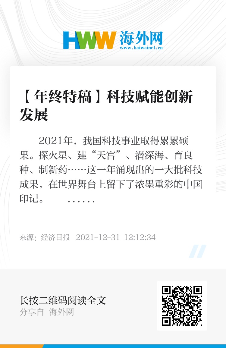 科技惠民利民,科技赋能增效。回顾2021年,科技创新驱动着我国经济的高质量发展;展望2022年,科技创新将支撑我国继续向第二个百年奋斗目标进军!(经济日报-中国经济网记者 佘惠敏)