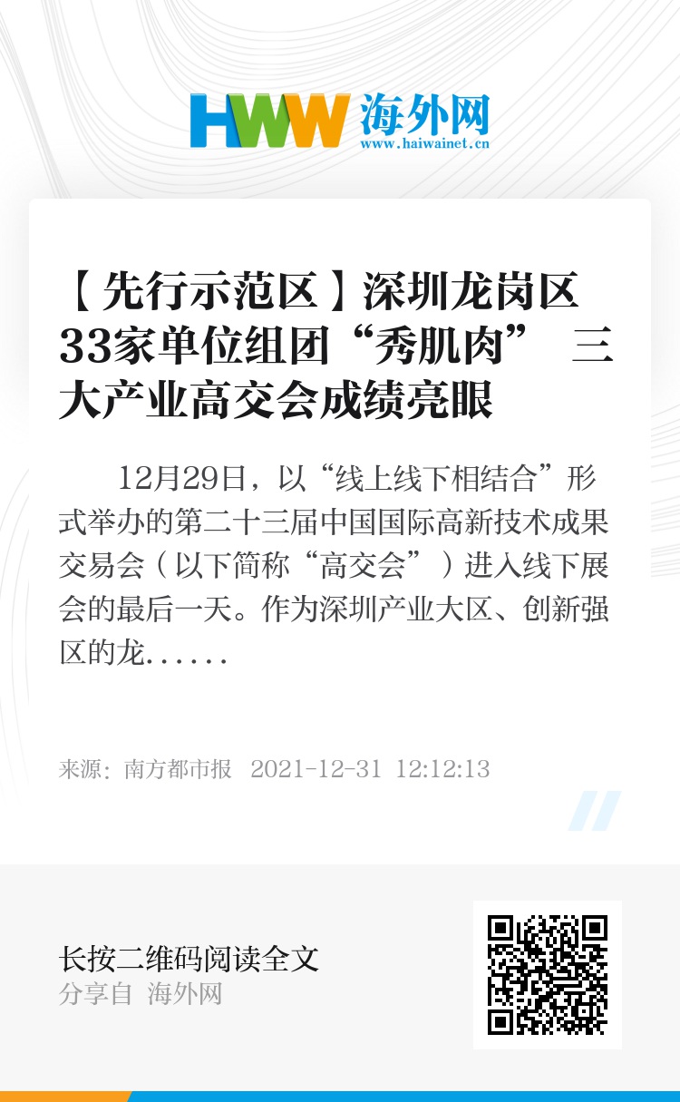 12月29日,以“线上线下相结合”形式举办的第二十三届中国国际高新技术成果交易会(以下简称“高交会”)进入线下展会的最后一天。作为深圳产业大区、创新强区的龙岗,在本届高交会携手辖区企业、高校、科研院所等33家单位70款产品组团参展。另外,还有高巨创新、国显科技等53家区内优秀企业、机构独立参展,总参展企业、机构达86家。