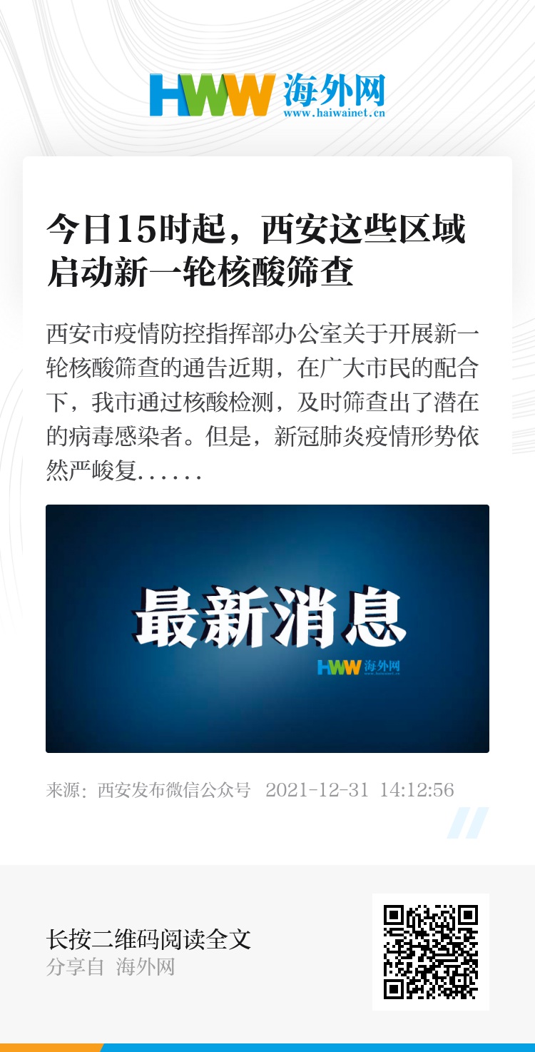 近期,在广大市民的配合下,我市通过核酸检测,及时筛查出了潜在的病毒感染者。但是,新冠肺炎疫情形势依然严峻复杂,为了快速、精准、彻底阻断疫情,市疫情防控指挥部研究决定,自12月31日15时起启动新一轮核酸筛查工作。现就有关事项通告如下: