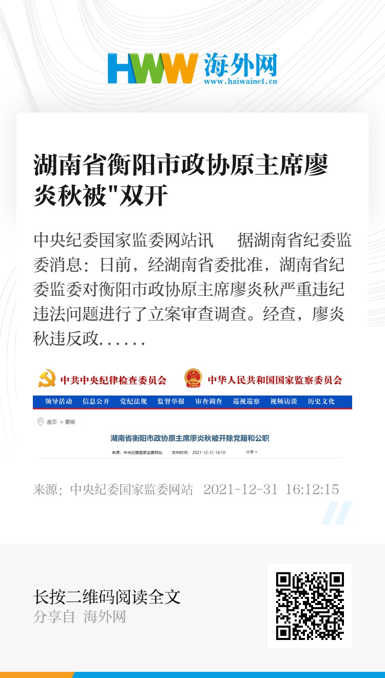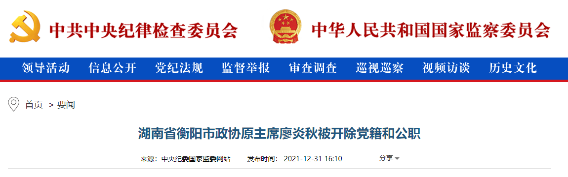 中央纪委国家监委网站讯 据湖南省纪委监委消息:日前,经湖南省委批准,湖南省纪委监委对衡阳市政协原主席廖炎秋严重违纪违法问题进行了立案审查调查。